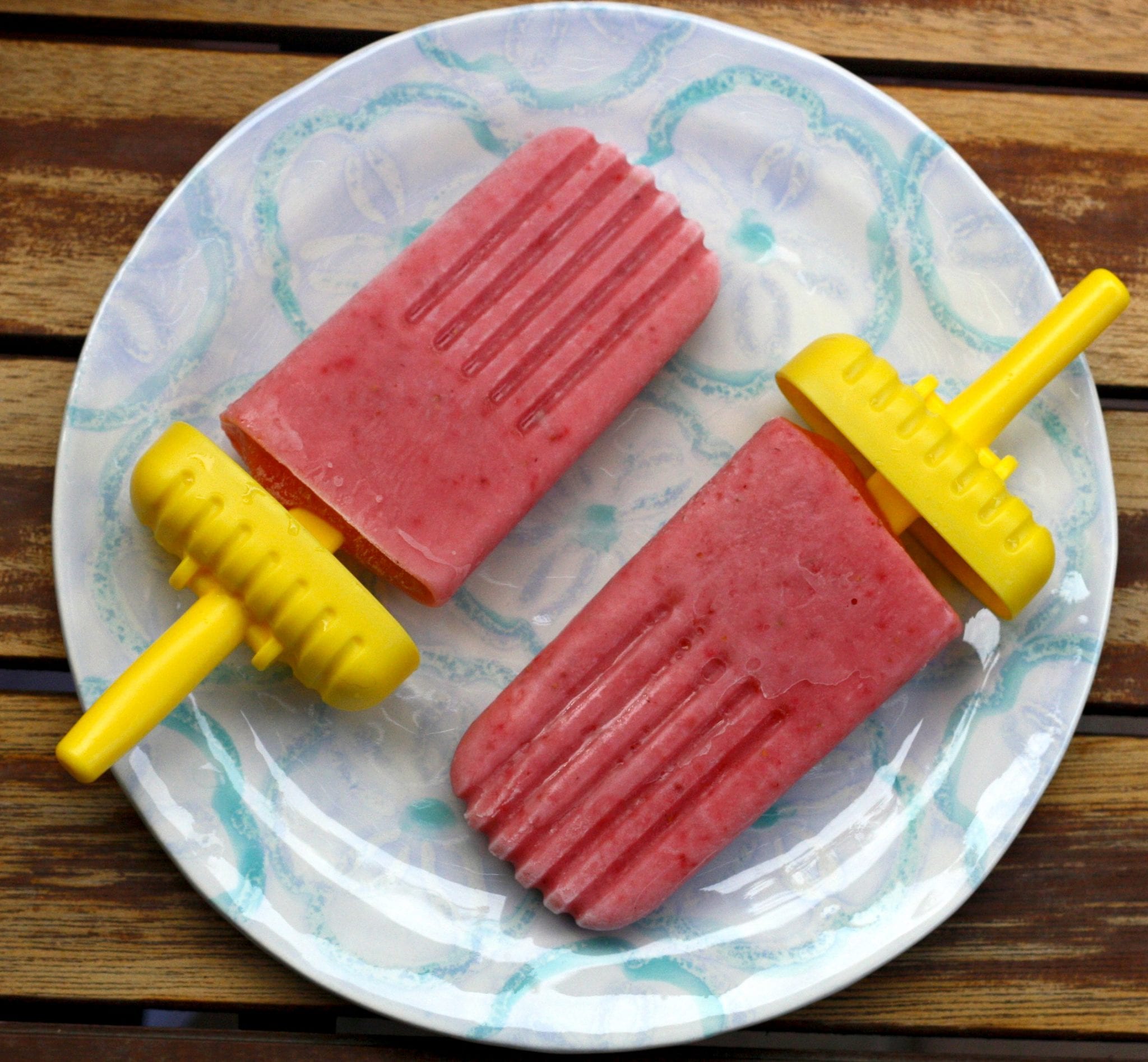 You don’t need a fancy blender or even a bowl to stir this up with…..just a set of popsicle molds and your everyday blender. I have had this Tovolo set for a couple of years and in fact I loved them so much I also have a set of rocket popsicle molds that I used to make the Homemade Fudgesicle Recipe that we shared with you last summer. They can be purchased on Amazon. They are inexpensive and easy to wash. Not only are these Strawberry Orange Banana Popsicles a quick recipe to make, they only require 5 ingredients. Since strawberries have been abundant in our neck of the woods, I have been purchasing two to three pounds at a time and end up having to freeze some by the weekend. Bananas are a household staple and oranges are easy to come by as well. Throw in one banana, some strawberries, the juice of one orange, low-fat vanilla yogurt, and lastly a some agave syrup or honey and you are set. I timed this, 5 minutes or less and you will have the mixture for these Strawberry Orange Banana Popsicles. Your kids will love them and you will love letting them enjoy this healthy frozen treat.